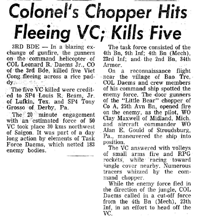 There is more to this story that the newspaper did not see fit to print. We received three to five rounds in the aircraft and were shot down that day (forced landing). Here I give you my written account, never before published, from a recent email to a veterans group..