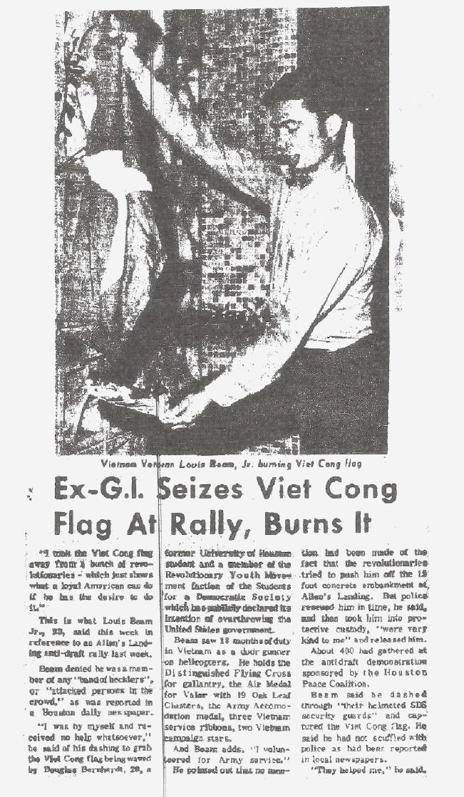 Without a moments hesitation I rushed into the throng of flag guards grabbing and yanking the flag down and close to my chest before they knew what had happened or my intent. Placing it inside of my jacket I attempted to "run with it." Not a good exit strategy exactly, but I did not care one "hoot" as we say in these parts of the world. I was going to have the flag and did not give or allow myself the smallest thought toward the consequences of the effort. Before I could clear the crowd of several hundred people I was thrown to the pavement where the "red guard" begin to stomp upon my head and body while kicking me. One of them shouted to throw me over the concrete embankment above the bayou that ran past the rally site so they were concurrently dragging me toward their exit strategy for me. In those days it was a considerable drop but easily survivable by me as I was an excellent swimmer. The Houston Police (God bless them) saw my predicament and came charging into the crowd with batons wildly swinging knocking commies off of me right and left. Suddenly I could breath again as the weight of so many people pummeling and kicking were lifted from my body by the police. The commies began fighting with the police at the same time so there was considerable ado at that moment. I felt strong hands around me as I was lifted from the pavement by two brave officers. Then began the quick exit from the mist of the horde, till we reached safety. As we broke through the crowd I reached into my jacket and triumphantly raised the wadded VC flag up over my head (a picture in the Houston Post recorded this moment).